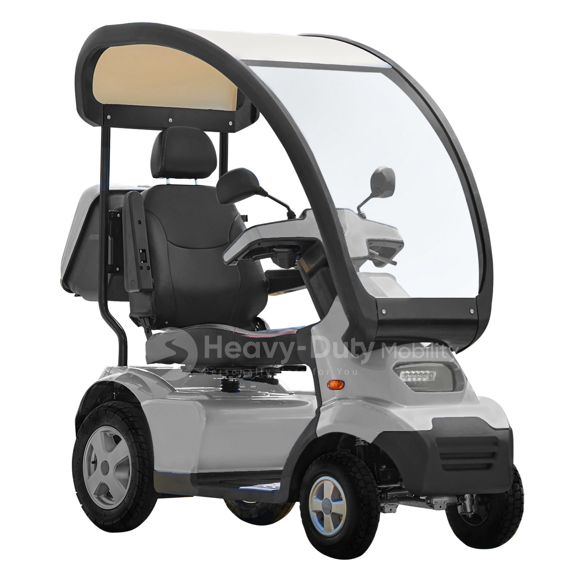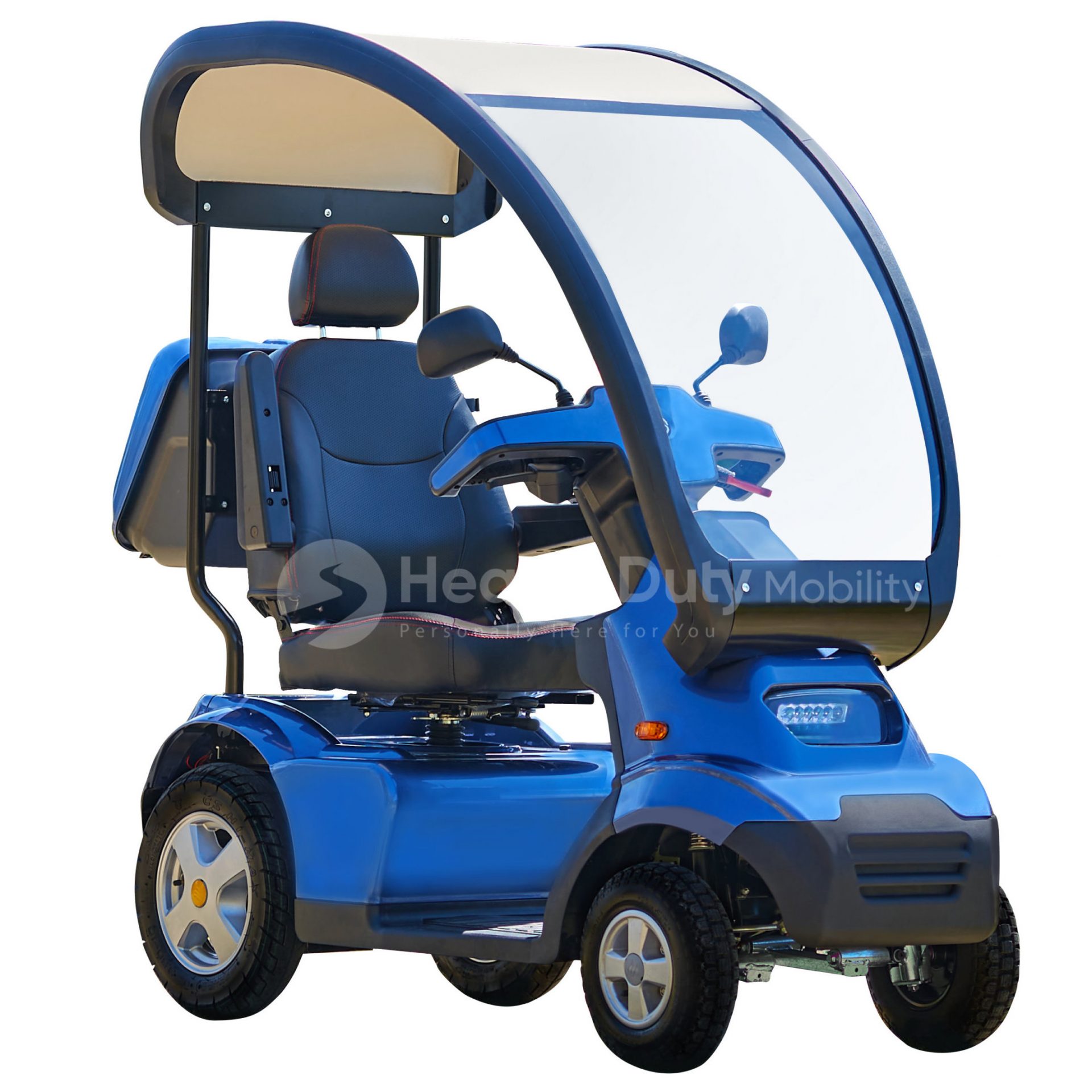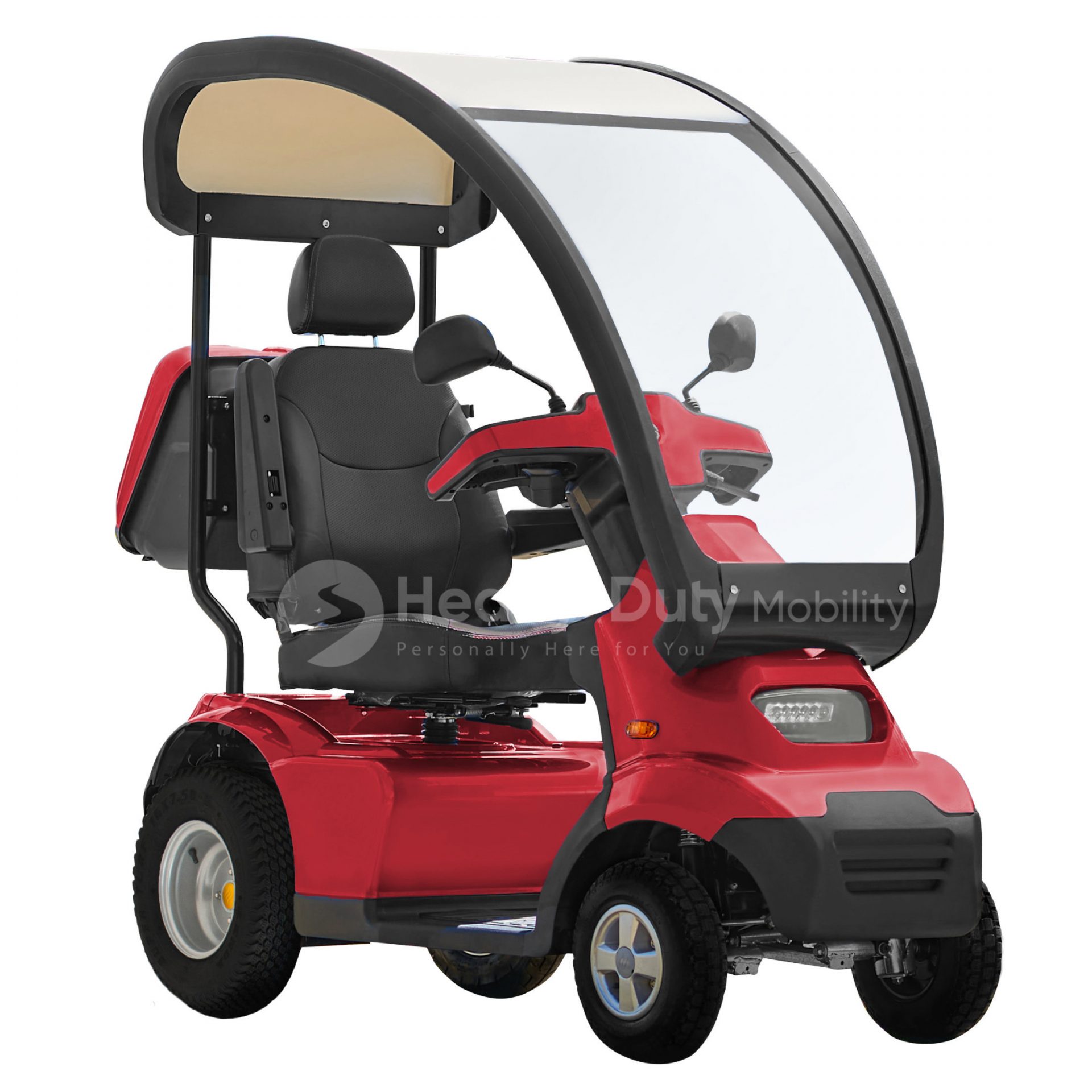 Comfort and dependability are built into every part of the heavy-duty design of the Afiscooter S4 Canopy. Possibly the most prominent feature is the canopy, itself. The canopy attachment is among the best designed mobility scooter canopies on the market today. It features a wide-angle windshield and wide-degree visibility format, so you don't have to contend with blind spots. The Afiscooter S4 Canopy is the ideal solution for any mobility challenged individual that does not slow down simply because the weather is not ideal.The all-weather, all terrain design of the Afiscooter S4 Canopy makes it easy to venture anywhere you want to go with less compromise. Four high end wheels provide optimal stability and dependability in both urban and rural environments. Whether you are headed to the store or going to a friend’s house, you'll enjoy the heavy-duty, all-weather design of this 4-wheel mobility scooter.The Afiscooter S4 Canopy has the ability to travel 31+ miles on a single charge at a speed of up to 11mph, depending on motor size chosen for your device.This scooter makes travel easy and fun, but safety is always apparent as well. Dual rear-view mirrors, an onboard headlight, horn, and blinker system help you remain safe on every journey. There is no limit to where the Afiscooter S4 Canopy can take you. Take the time to explore more about the impressively designed Afiscooter S4 Canopy and what it can do to enhance your personal mobility.Not A Light Duty Mobility Device