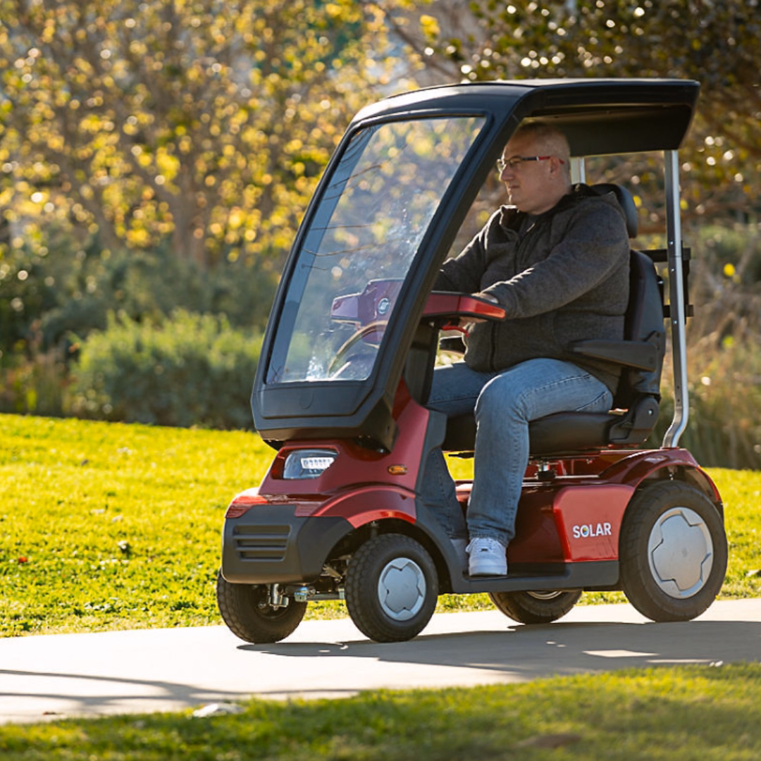 Afiscooter has been proudly providing mobility challenged individuals with heavy duty, high end mobility scooters since 1978, and since that time they have learned a lot about what their users desire from their brand.The Afiscooter S4 Canopy is the culmination of decades of comprehensive design and this model features a robust format that will truly take you anywhere. With a steep climbing angle ability and a 5” ground clearance, the Afiscooter S4 Canopy is among the best designed all-terrain models of its era.Not only will the Afiscooter S4 Canopy get you where you need to be, it ensures your comfort throughout the journey. A dual suspension system allows the scooter to effortlessly glide from smooth to rough terrain without negatively impacting the rider’s comfort level. Upgrades to the rear wheels are available as well - you can upgrade to heavy-duty, extra wide golf tires that have an awesome grip on the road.Ergonomic Design at Every Angle