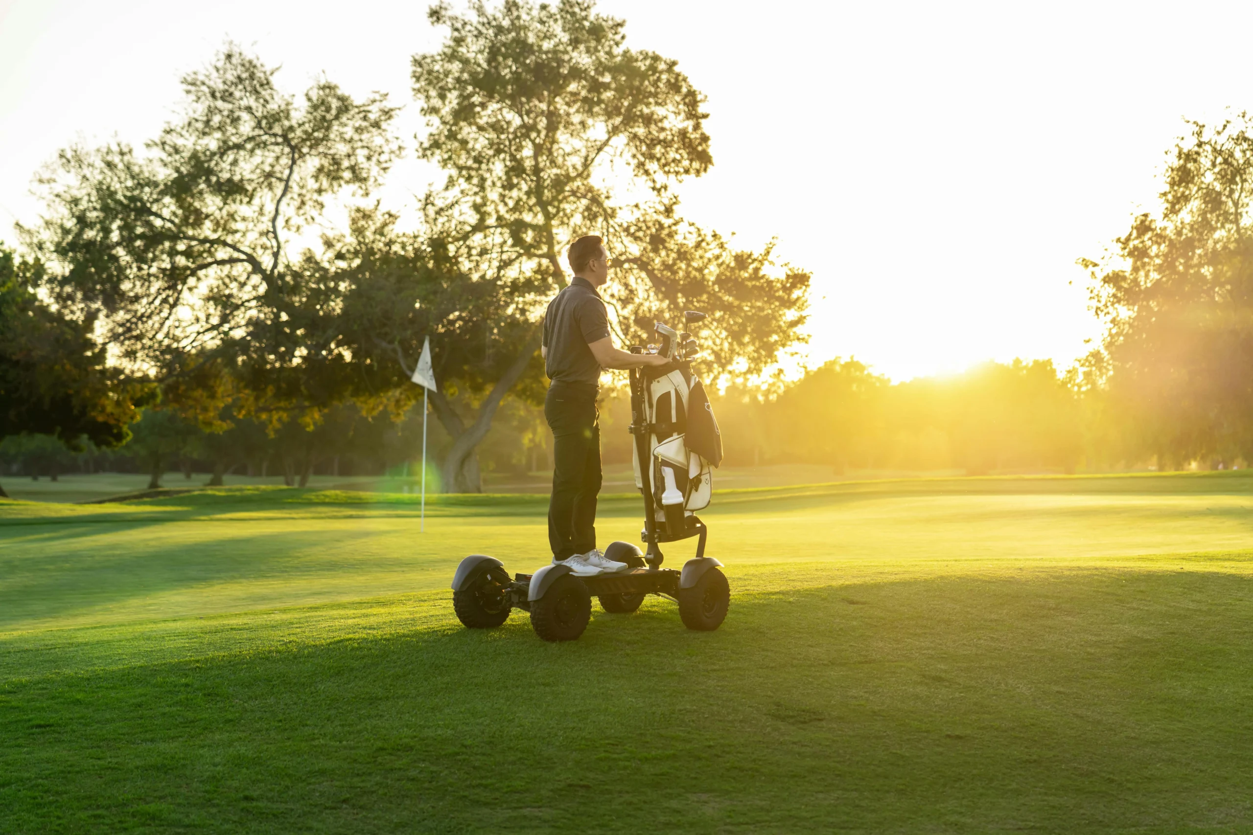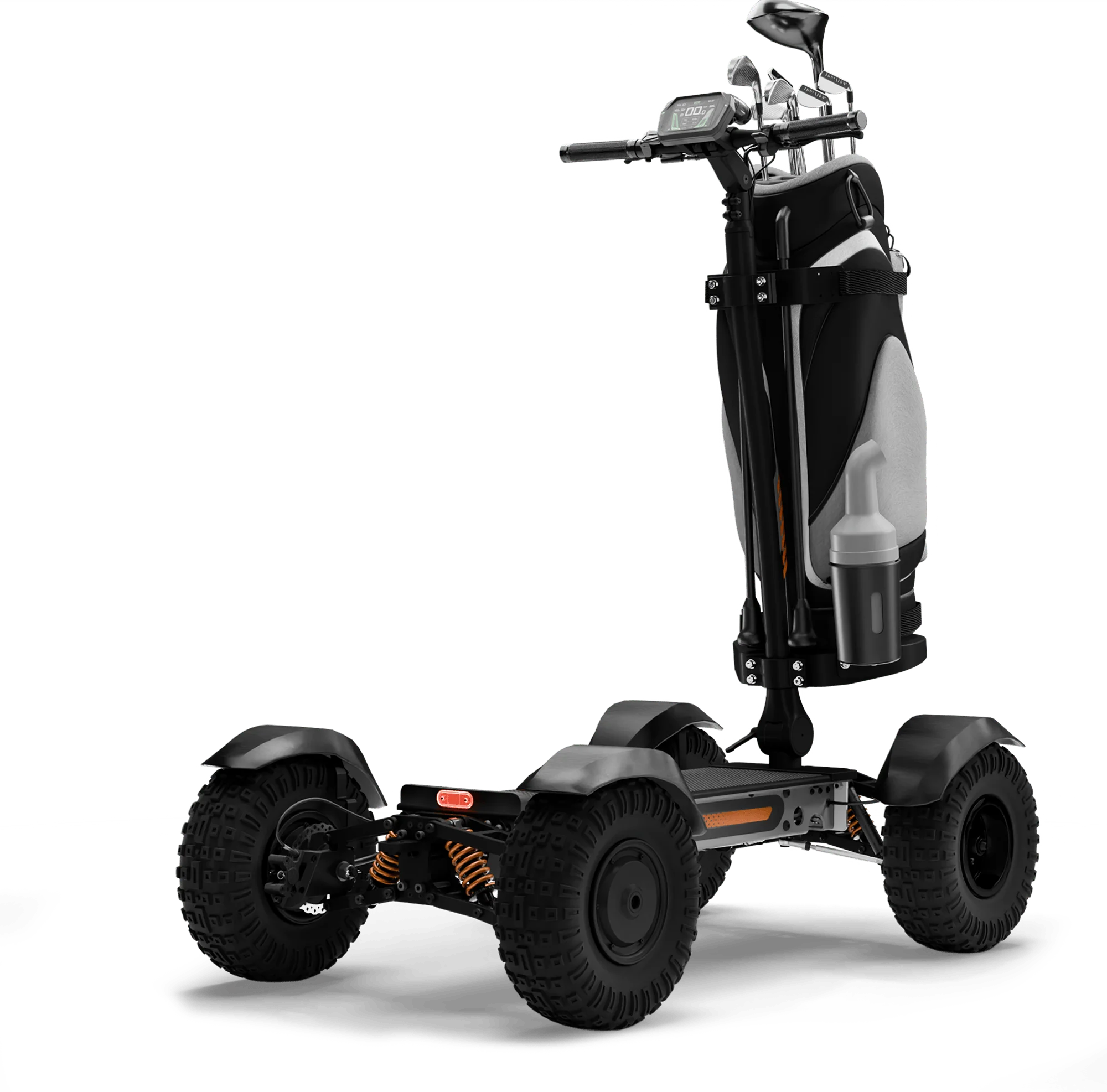 This scooter is built specifically for golf use. The golf bag mount securely holds your clubs while you ride, letting you move quickly between shots without needing a traditional golf cart. The turf-friendly tires help protect the grass while providing excellent grip and stability on fairways and paths.