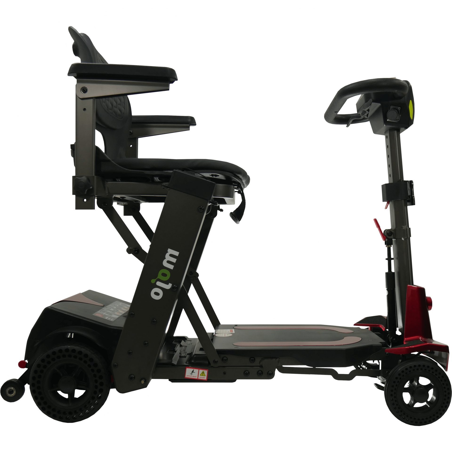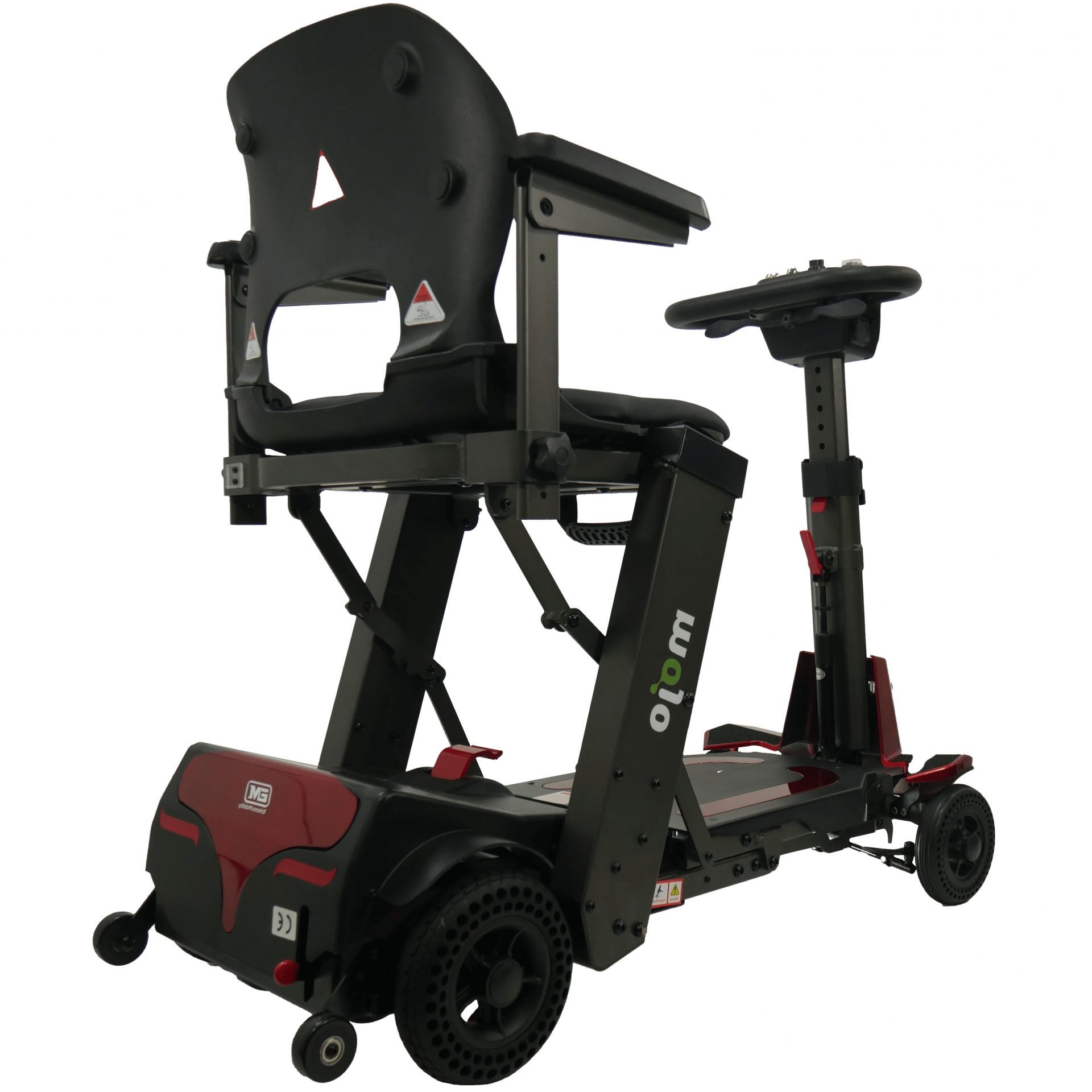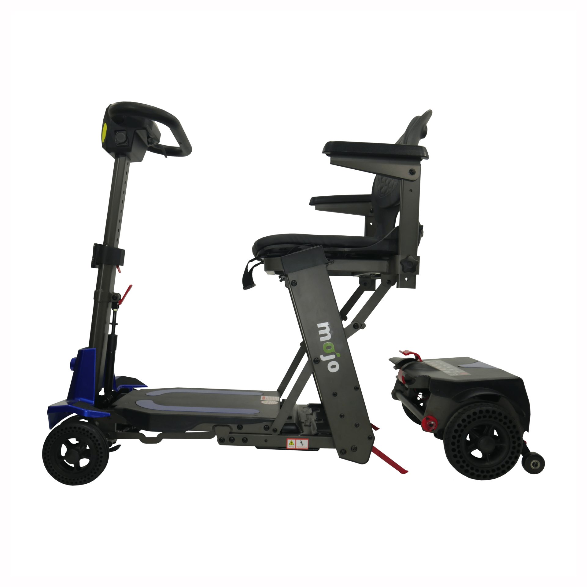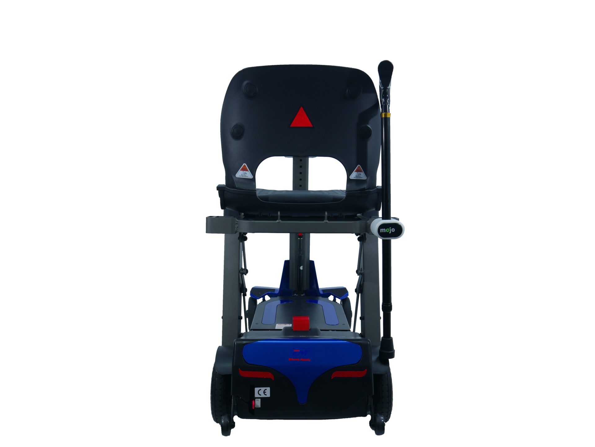 The Mojo Auto-Folding Scooter has a top speed of up to 3.75 mph, giving you a smooth and enjoyable ride. The total weight, including batteries, is just 58 lbs, making it one of the lightest scooters available. Even when split, the heaviest piece is only 38 lbs.Remote Control Key Fob Features